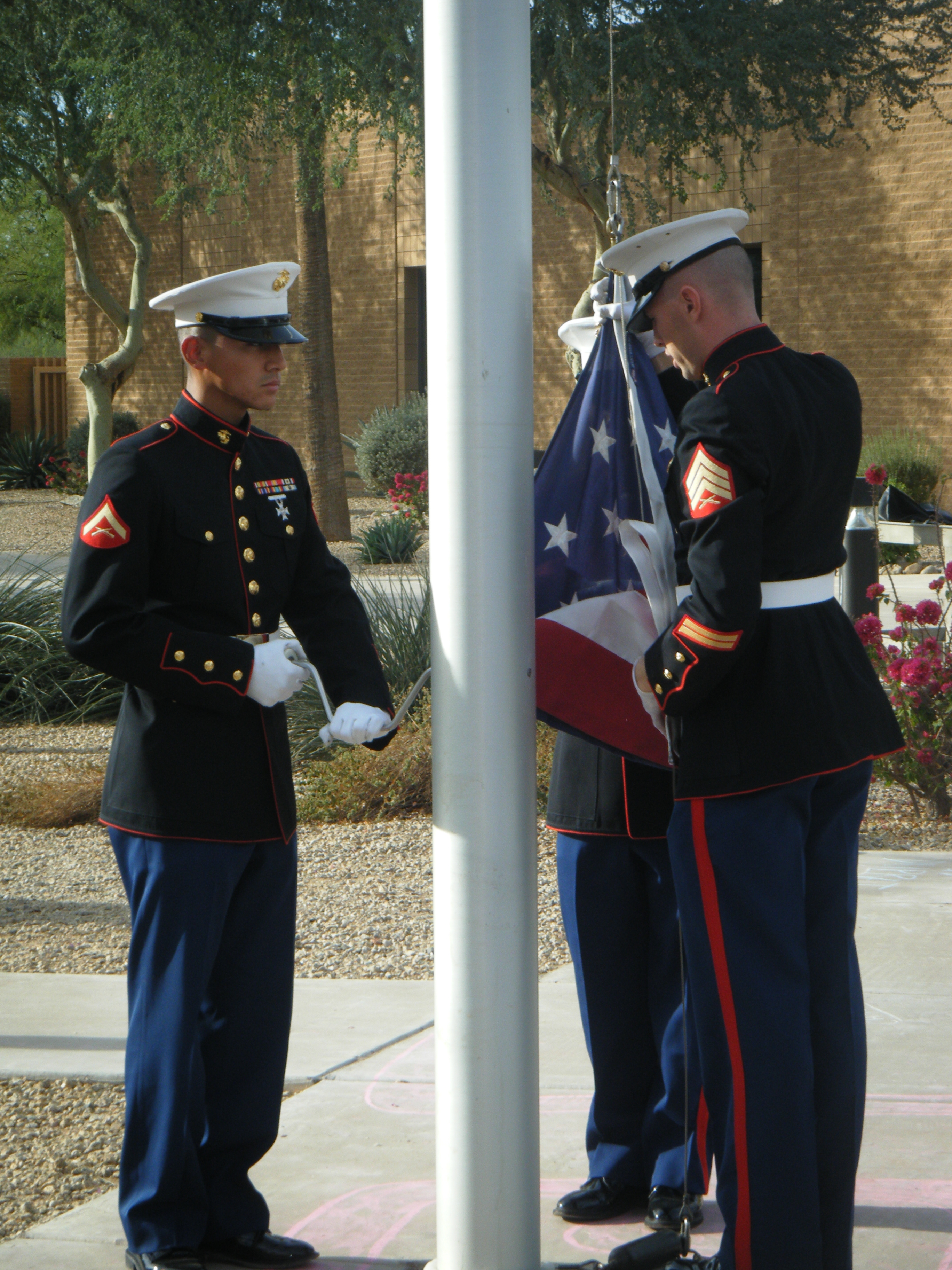 On Tuesday, November 10, 2009, Estrella Mountain Community College held it's first annual Veteran's Day Celebration which included a flag raising by the United States Marine Color Guard, speeches delivered by veterans, and a large gathering of appreciative college faculty, staff and students. The event was sponsored by the college's Veteran's Services Office.