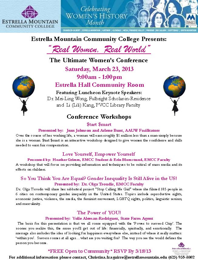 Avondale, Arizona – Estrella Mountain Community College (EMCC), a Maricopa Community College, is celebrating Women’s History Month during the entire month of March 2103. All events and activities are free and open to the public, held on the EMCC campus, located on 3000 North Dysart Road in Avondale.