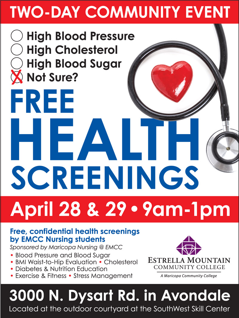 AVONDALE, Arizona – Top-notch nursing students at Estrella Mountain Community College (EMCC) will be offering free health screenings to the community on Monday, April 28 and Tuesday, April 29 from 9 a.m. – 1 p.m. on the EMCC campus, located on 3000 N. Dysart Rd. in Avondale.